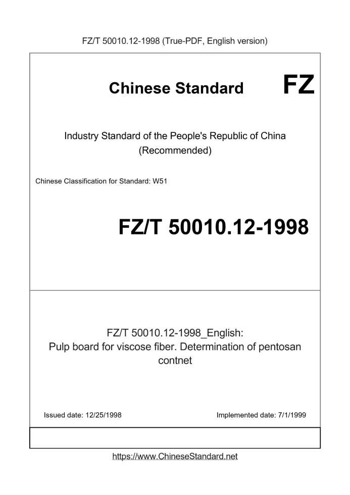 Delivery: <= 3 days. True-PDF full-copy in English will be manually translated and delivered via email. FZ/T 50010.12-1998: Pulp board for viscose fiber. Determination of pentosan contnet