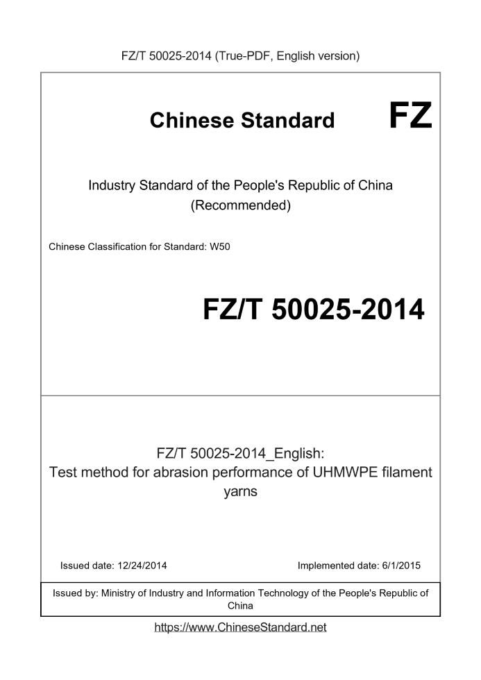 Delivery: <= 3 days. True-PDF full-copy in English will be manually translated and delivered via email. FZ/T 50025-2014: Test method for abrasion performance of UHMWPE filament yarns Status: Valid