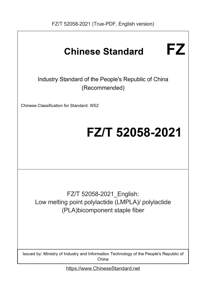 Delivery: <= 3 days. True-PDF full-copy in English will be manually translated and delivered via email. FZ/T 52058-2021: Low melting point polylactide (LMPLA)/ polylactide (PLA)bicomponent staple fiber Status: Valid
