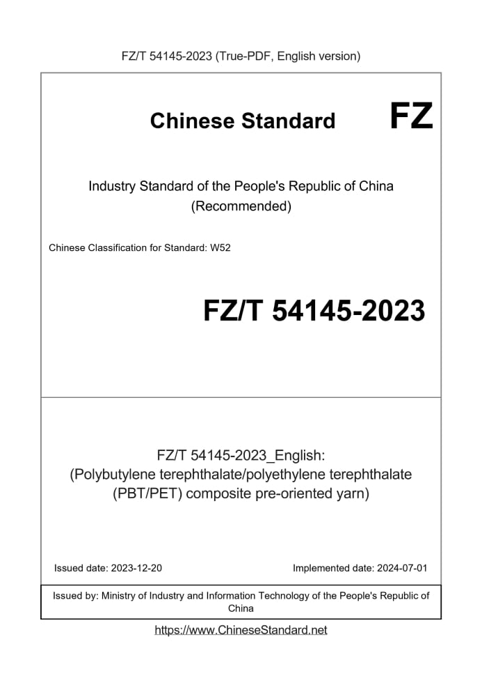 Delivery: <= 3 days. True-PDF full-copy in English will be manually translated and delivered via email. FZ/T 54145-2023: (Polybutylene terephthalate/polyethylene terephthalate (PBT/PET) composite pre-oriented yarn) Status: Valid