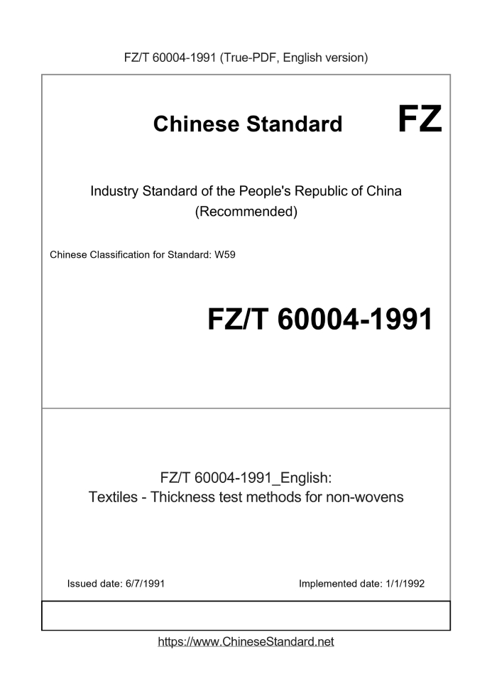 Delivery: <= 2 days. True-PDF full-copy in English will be manually translated and delivered via email. FZ/T 60004-1991: Textiles - Thickness test methods for non-wovens Status: Obsolete