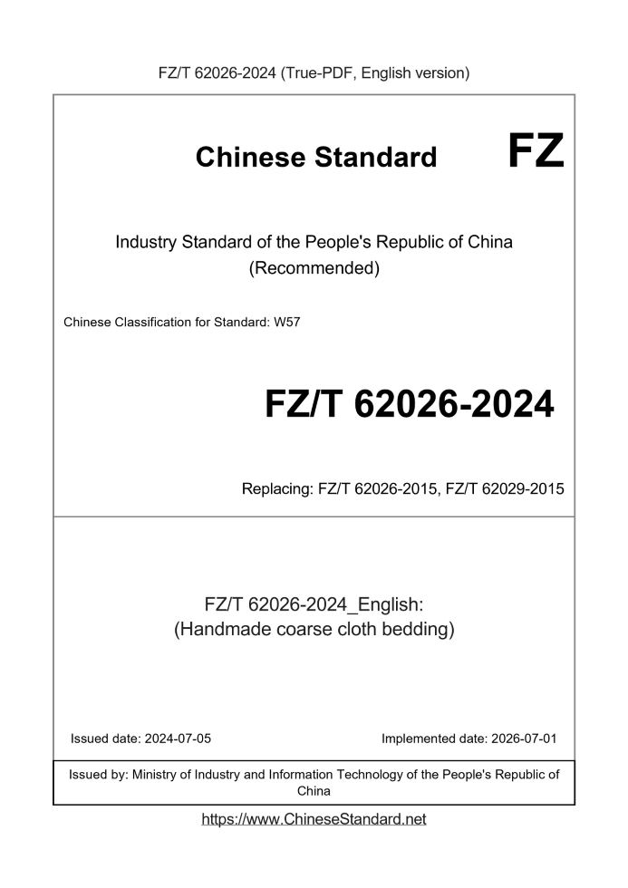 Delivery: <= 3 days. True-PDF full-copy in English will be manually translated and delivered via email. FZ/T 62026-2024: (Handmade coarse cloth bedding) Status: Valid FZ/T 62026: Historical versions