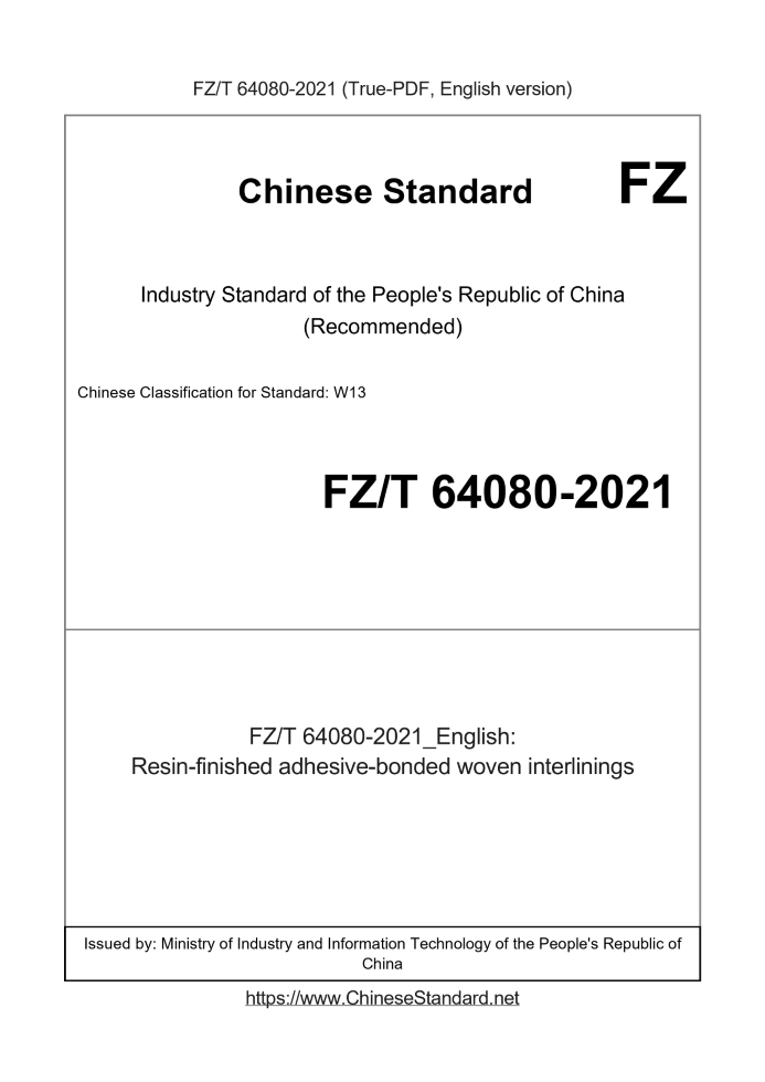 Delivery: <= 3 days. True-PDF full-copy in English will be manually translated and delivered via email. FZ/T 64080-2021: Resin-finished adhesive-bonded woven interlinings Status: Valid