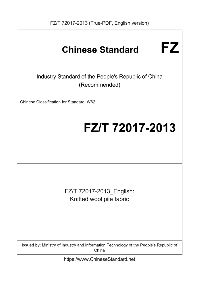 Delivery: <= 3 days. True-PDF full-copy in English will be manually translated and delivered via email. FZ/T 72017-2013: Knitted wool pile fabric Status: Valid