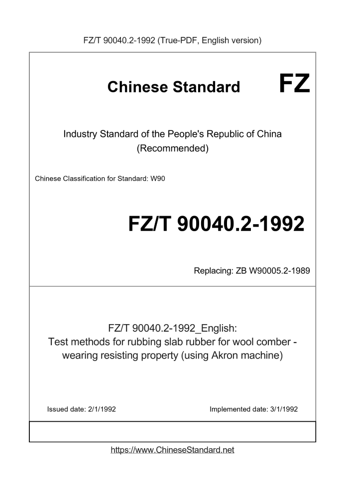 Delivery: <= 2 days. True-PDF full-copy in English will be manually translated and delivered via email. FZ/T 90040.2-1992: Test methods for rubbing slab rubber for wool comber - wearing resisting property (using Akron machine)