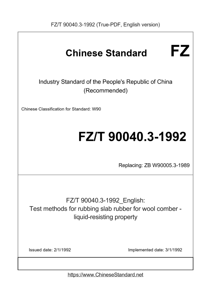 Delivery: <= 2 days. True-PDF full-copy in English will be manually translated and delivered via email. FZ/T 90040.3-1992: Test methods for rubbing slab rubber for wool comber - liquid-resisting property