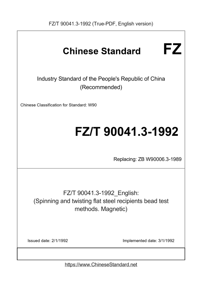 Delivery: <= 2 days. True-PDF full-copy in English will be manually translated and delivered via email. FZ/T 90041.3-1992: (Spinning and twisting flat steel recipients bead test methods. Magnetic) Status: Obsolete
