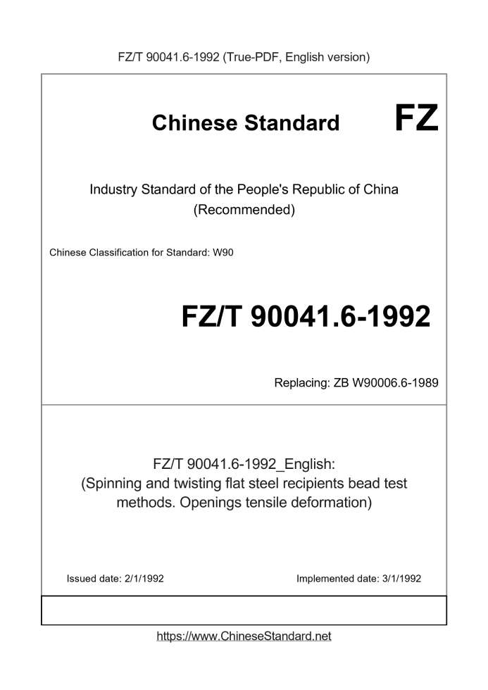 Delivery: <= 2 days. True-PDF full-copy in English will be manually translated and delivered via email. FZ/T 90041.6-1992: (Spinning and twisting flat steel recipients bead test methods. Openings tensile deformation) Status: Obsolete