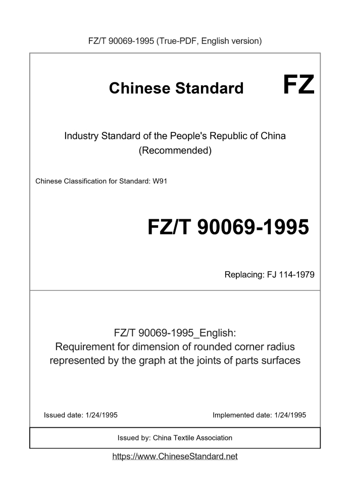 Delivery: <= 2 days. True-PDF full-copy in English will be manually translated and delivered via email. FZ/T 90069-1995: Requirement for dimension of rounded corner radius represented by the graph at the joints of parts surfaces Status: Obsolete