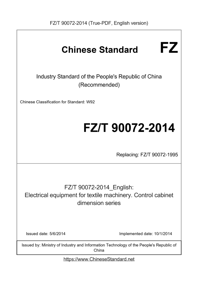 Delivery: <= 2 days. True-PDF full-copy in English will be manually translated and delivered via email. FZ/T 90072-2014: Electrical equipment for textile machinery. Control cabinet dimension series Status: Valid FZ/T 90072: Historical versions