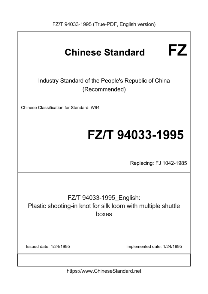 Delivery: <= 2 days. True-PDF full-copy in English will be manually translated and delivered via email. FZ/T 94033-1995: Plastic shooting-in knot for silk loom with multiple shuttle boxes