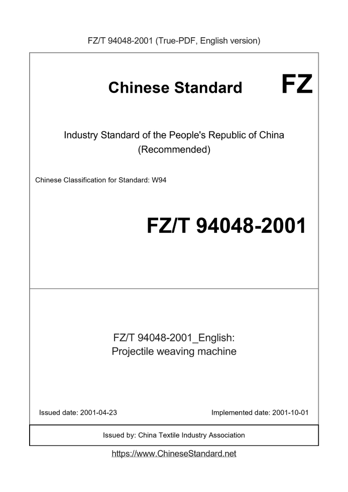 Delivery: <= 3 days. True-PDF full-copy in English will be manually translated and delivered via email. FZ/T 94048-2001: Projectile weaving machine Status: Valid