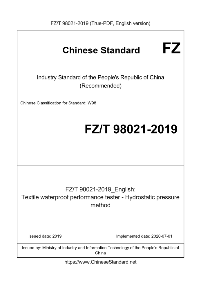 Delivery: <= 3 days. True-PDF full-copy in English will be manually translated and delivered via email. FZ/T 98021-2019: Textile waterproof performance tester - Hydrostatic pressure method Status: Valid