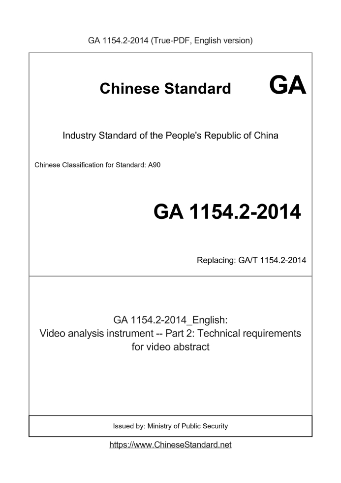 Basic dataStandard ID: GA 1154.2-2014 (GA1154.2-2014)Description (Translated English): Video analysis instrument -- Part 2: Technical requirements for video abstract Sector / Industry: Public Security (Police) Industry Standard Classification of Chinese Standard: A90 Regulation (derived from): Announcement on Releasing Public Safety Industry Standard (Year of 2014) Issuing agency(ies): Ministry of Public Security GA/T 1154.2-2014: Video analysis instrument-Part 2: Technical requirements for video abstract---This is a DRAFT version for illustration, not a final translation. Full copy of true-PDF in English version (including equations, symbols, images, flow-chart, tables, and figures etc.) will be manually/carefully translated upon your order.Video analysis instrument-Part 2. Technical requirements for video abstract ICS 13.310 A90 People's Republic of China Public Security Industry Standards Video image analyzer Part 2. Summary of Technical Requirements video Issued on. 2014-04-18 2014-08-01 implementation People's Republic of China Ministry of Public Security ForewordGA/T 1154 "video image analyzer" intends divided into the following sections. --- Part 1. Common technical requirements; --- Part 2. Video Images Summary technical requirements; --- Part 3. video image retrieval technology requirements; --- Part 4. video face-matching technology requirements; --- Part 5. Video Image Enhancement and Restoration technical requirements; --- Part 6. video semantic description of the technical requirements. This section GA/T 1154 Part 2. This section drafted in accordance with GB/T 1.1-2009 given rules. Please note that some of the content of this document may involve patents. Release mechanism of the present document does not assume responsibility for the identification of these patents. This section proposed by the Guangdong Public Security Bureau. This part of the jurisdiction of the Ministry of Public Security Public Security Applications Standardization Technical Committee. This section drafted by. Guangdong Provincial Public Security, the Ministry of Science and Technology Information Technology Communications Security Bureau Station, Guangzhou Jia Kawasaki Intelligent Technology Co., First Research Institute of Ministry of Public Security, Ministry of Public Security the third Institute of Computer Science and Engineering, South China University of Technology, Guangdong crown Network Information Technology Co., the company. The main drafters of this section. Michael group, Han Mi Hong, Wang Shi Jun, Yu Zhongyi, Hu Park, Xiejia Liang, Zhang Cong Zhe, Peng Yu cattle, Han Guoqiang, Hu Haitao, Yangtie Min, Chen Zhaowu, Hu Zhuanping. Video image analyzer Part 2. Summary of Technical Requirements video1 ScopeGA/T 1154 This section provides a summary with video capabilities video image analyzer terms and definitions, acronyms, technical Operation requirements, test methods, inspection rules. This section applies to have the video summary feature video image analyzer R & D, production and testing.2 Normative referencesThe following documents for the application of this document is essential. For dated references, only the dated version suitable for use herein Member. For undated references, the latest edition (including any amendments) applies to this document. GB 20815 video monitoring digital video equipment GB/T 30147-2013 security monitoring real-time intelligent video analysis equipment technical requirements GB 50198-2011 civil closed circuit monitoring TV system engineering GA/T 1154.1-2014 video image analyzer - Part 1. General requirements 3 Terms and definitions, abbreviations 3.1 Terms and Definitions GA/T 1154.1-2014, GB 20815, GB/T 30147-2013 define the following terms and definitions apply to this document. 3.1.1 Moving Target movingtarget Greater than or equal to the video (10 × 10) pix, speeds between (15 ~ 100) pix/s of the moving object. 3.1.2 Follow goal focustarget Moving Object of attention. 3.1.3 Video Summary videoabstract Removing redundant portions of the video Central African concern, attention reserved portion to generate a new video file to rebuild in the same video screen is not the same Follow the process target image between points. 3.1.4 Clue video cluevideo Taken from a video containing an object of interest in a video clip. 3.1.5 Screenshot clues cluecapture Taken from the video frame containing the object of interest. ......Tips & Frequently Asked Questions:Question 1: How long will the true-PDF of GA 1154.2-2014_English be delivered?Answer: Upon your order, we will start to translate GA 1154.2-2014_English as soon as possible, and keep you informed of the progress. The lead time is typically 1 ~ 3 working days. The lengthier the document the longer the lead time.Question 2: Can I share the purchased PDF of GA 1154.2-2014_English with my colleagues?Answer: Yes. The purchased PDF of GA 1154.2-2014_English will be deemed to be sold to your employer/organization who actually pays for it, including your colleagues and your employer's intranet.Question 3: Does the price include tax/VAT?Answer: Yes. Our tax invoice, downloaded/delivered in 9 seconds, includes all tax/VAT and complies with 100+ countries' tax regulations (tax exempted in 100+ countries) -- See Avoidance of Double Taxation Agreements (DTAs): List of DTAs signed between Singapore and 100+ countriesQuestion 4: Do you accept my currency other than USD?Answer: Yes. If you need your currency to be printed on the invoice, please write an email to Sales@ChineseStandard.net. In 2 working-hours, we will create a special link for you to pay in any currencies. Otherwise, follow the normal steps: Add to Cart -- Checkout -- Select your currency to pay.Question 5: Should I purchase the latest version GA 1154.2-2014?Answer: Yes. Unless special scenarios such as technical constraints or academic study, you should always prioritize to purchase the latest version GA 1154.2-2014 even if the enforcement date is in future.
