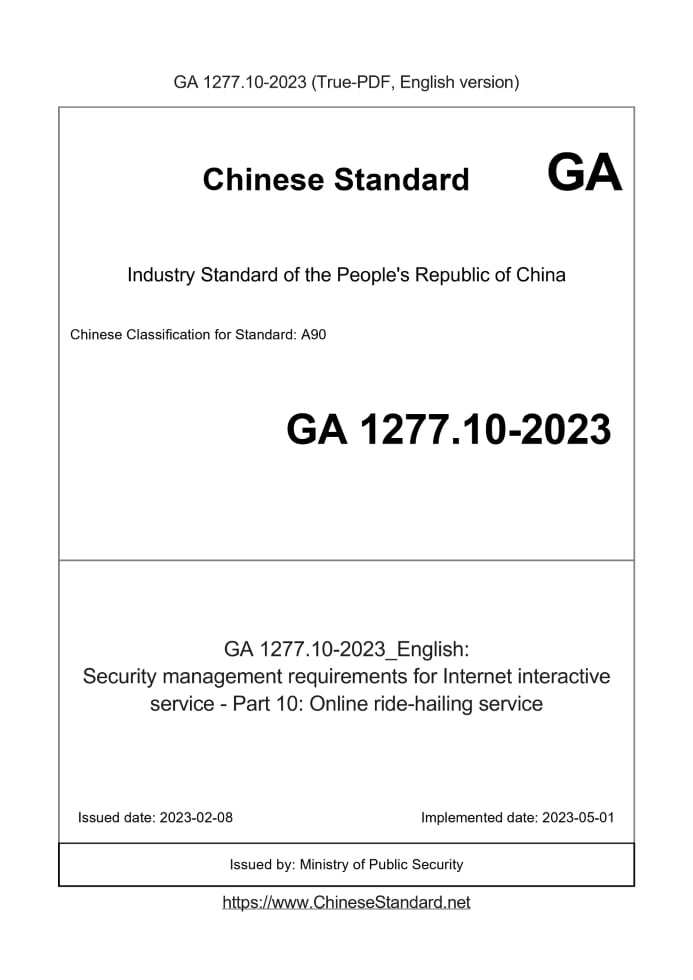 Delivery: <= 3 days. True-PDF full-copy in English will be manually translated and delivered via email. GA 1277.10-2023: Security management requirements for Internet interactive service - Part 10: Online ride-hailing service Status: Valid