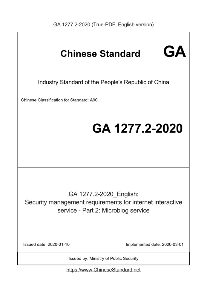 Delivery: <= 3 days. True-PDF full-copy in English will be manually translated and delivered via email. GA 1277.2-2020: Security management requirements for internet interactive service - Part 2: Microblog service Status: Valid