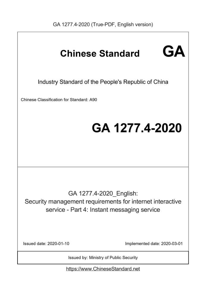 Delivery: <= 3 days. True-PDF full-copy in English will be manually translated and delivered via email. GA 1277.4-2020: Security management requirements for internet interactive service - Part 4: Instant messaging service Status: Valid