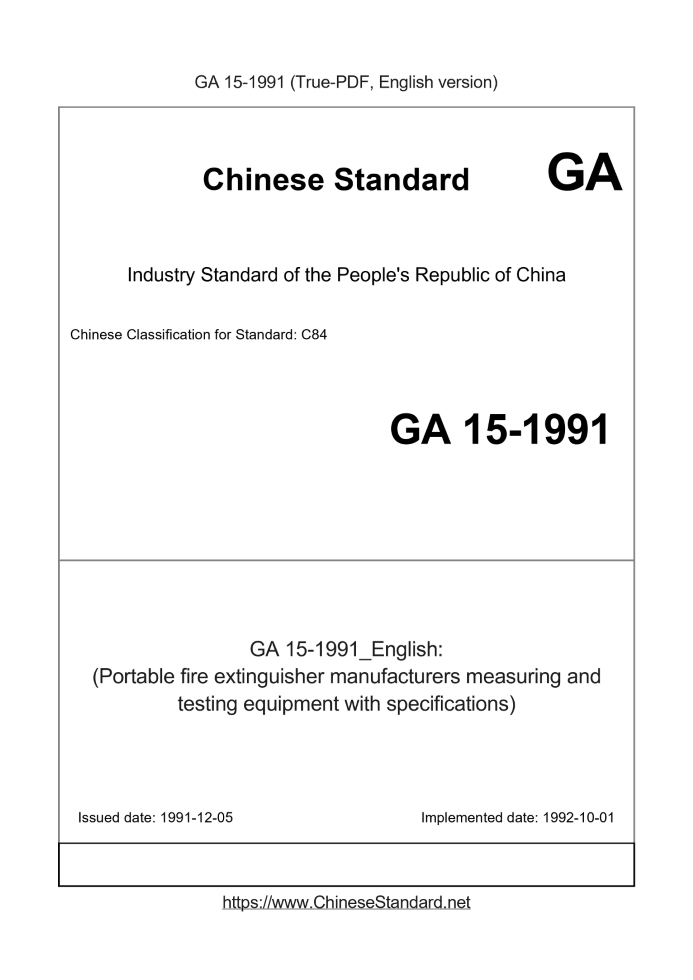 Delivery: <= 3 days. True-PDF full-copy in English will be manually translated and delivered via email. GA 15-1991: (Portable fire extinguisher manufacturers measuring and testing equipment with specifications) Status: Obsolete