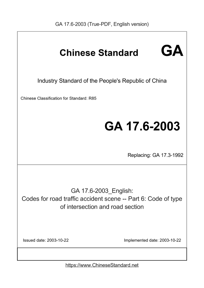 Delivery: <= 3 days. True-PDF full-copy in English will be manually translated and delivered via email. GA 17.6-2003: Codes for road traffic accident scene -- Part 6: Code of type of intersection and road section Status: Obsolete