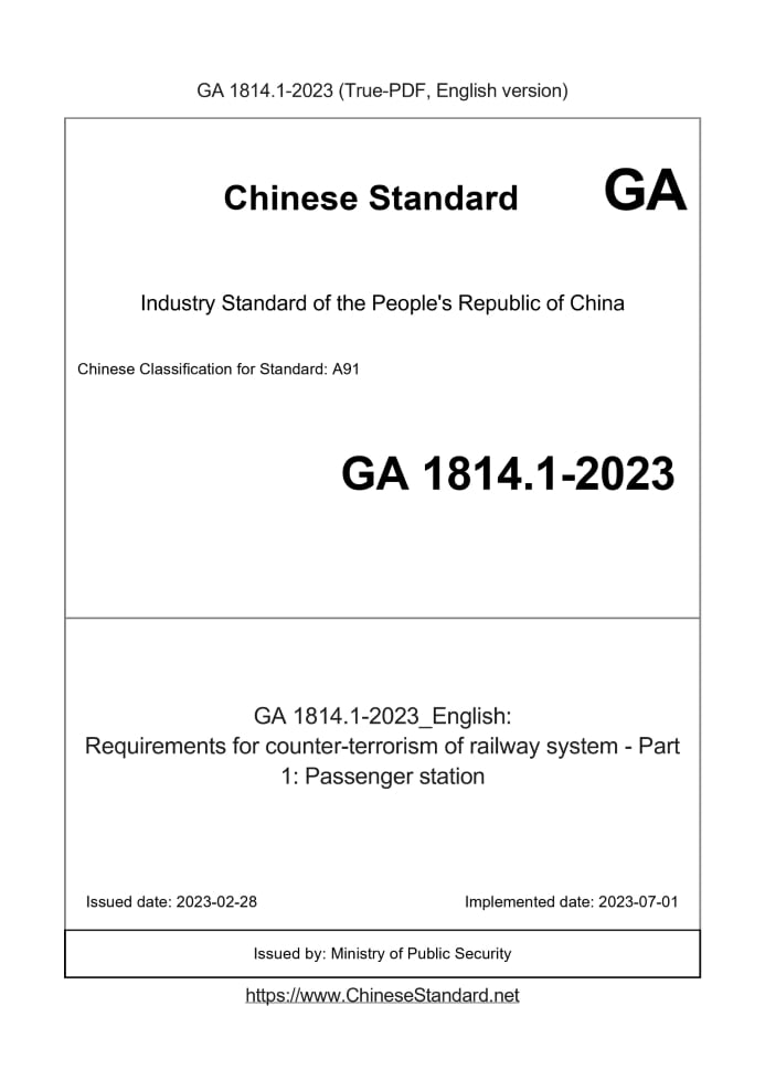 Delivery: <= 3 days. True-PDF full-copy in English will be manually translated and delivered via email. GA 1814.1-2023: Requirements for counter-terrorism of railway system - Part 1: Passenger station Status: Valid