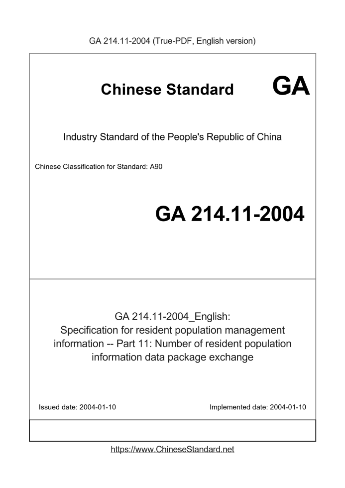 Delivery: <= 3 days. True-PDF full-copy in English will be manually translated and delivered via email. GA 214.11-2004: Specification for resident population management information -- Part 11: Number of resident population information data package exchange Status: Obsolete