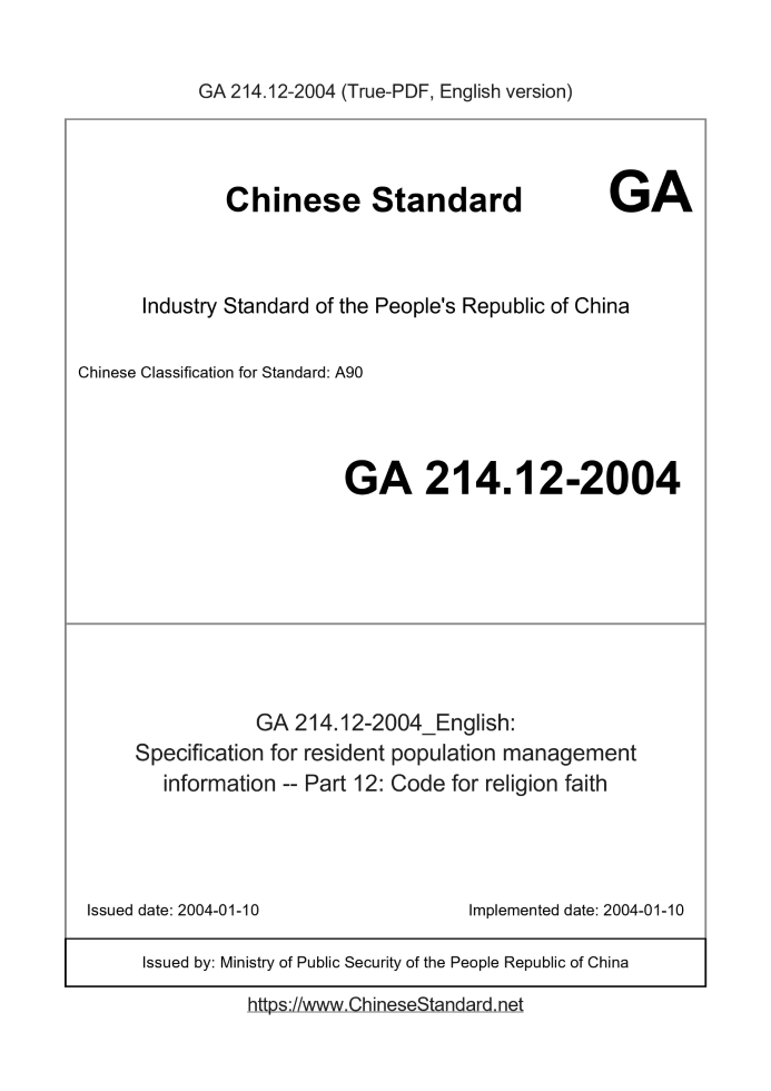 Delivery: <= 3 days. True-PDF full-copy in English will be manually translated and delivered via email. GA 214.12-2004: Specification for resident population management information -- Part 12: Code for religion faith