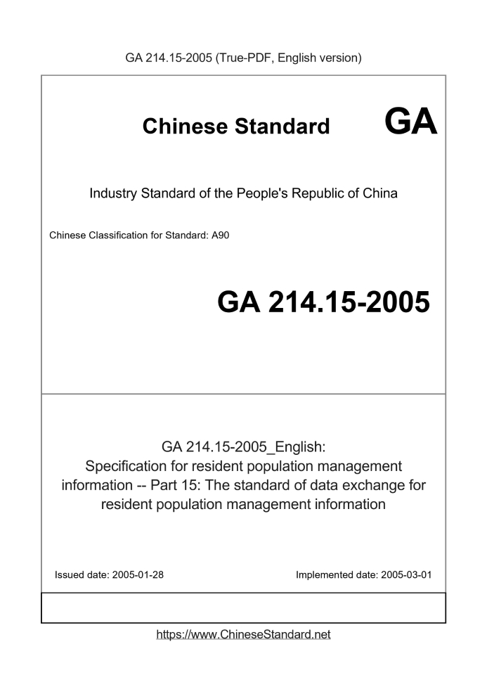 Basic dataStandard ID: GA 214.15-2005 (GA214.15-2005)Description (Translated English): Specification for resident population management information -- Part 15: The standard of data exchange for resident population management information Sector / Industry: Public Security (Police) Industry Standard Classification of Chinese Standard: A90 Classification of International Standard: 35.240.99 Word Count Estimation: 35,393 Date of Issue: 2005-01-28 Date of Implementation: 2005-03-01 Quoted Standard: GB/T 2260; GB/T 2261.1; GB/T 2261.2; GB/T 2659; GB/T 3304; GB/T 4658; GB/T 4761; GB/T 6565; GB 11643; GB 13000; GA 214.1; GA 214.2; GA 214.3; GA 214.4; GA 214.5; GA 214.6; GA 214.7; GA 214.8; GA 214.9; GA 214.10; GA 214.11; GA 214.12; GA 214.13; GA 214.14; GA 214.15; GA 214.16; GA Regulation (derived from): Industry standard filing notice 2016 No. 5 (total 197) Summary: This standard specifies the data exchange format for resident population management information implemented as a document. This standard is applicable to the data exchange between resident population management information systems above the city level. Tips & Frequently Asked Questions:Question 1: How long will the true-PDF of GA 214.15-2005_English be delivered?Answer: Upon your order, we will start to translate GA 214.15-2005_English as soon as possible, and keep you informed of the progress. The lead time is typically 1 ~ 3 working days. The lengthier the document the longer the lead time.Question 2: Can I share the purchased PDF of GA 214.15-2005_English with my colleagues?Answer: Yes. The purchased PDF of GA 214.15-2005_English will be deemed to be sold to your employer/organization who actually pays for it, including your colleagues and your employer's intranet.Question 3: Does the price include tax/VAT?Answer: Yes. Our tax invoice, downloaded/delivered in 9 seconds, includes all tax/VAT and complies with 100+ countries' tax regulations (tax exempted in 100+ countries) -- See Avoidance of Double Taxation Agreements (DTAs): List of DTAs signed between Singapore and 100+ countriesQuestion 4: Do you accept my currency other than USD?Answer: Yes. If you need your currency to be printed on the invoice, please write an email to Sales@ChineseStandard.net. In 2 working-hours, we will create a special link for you to pay in any currencies. Otherwise, follow the normal steps: Add to Cart -- Checkout -- Select your currency to pay. |