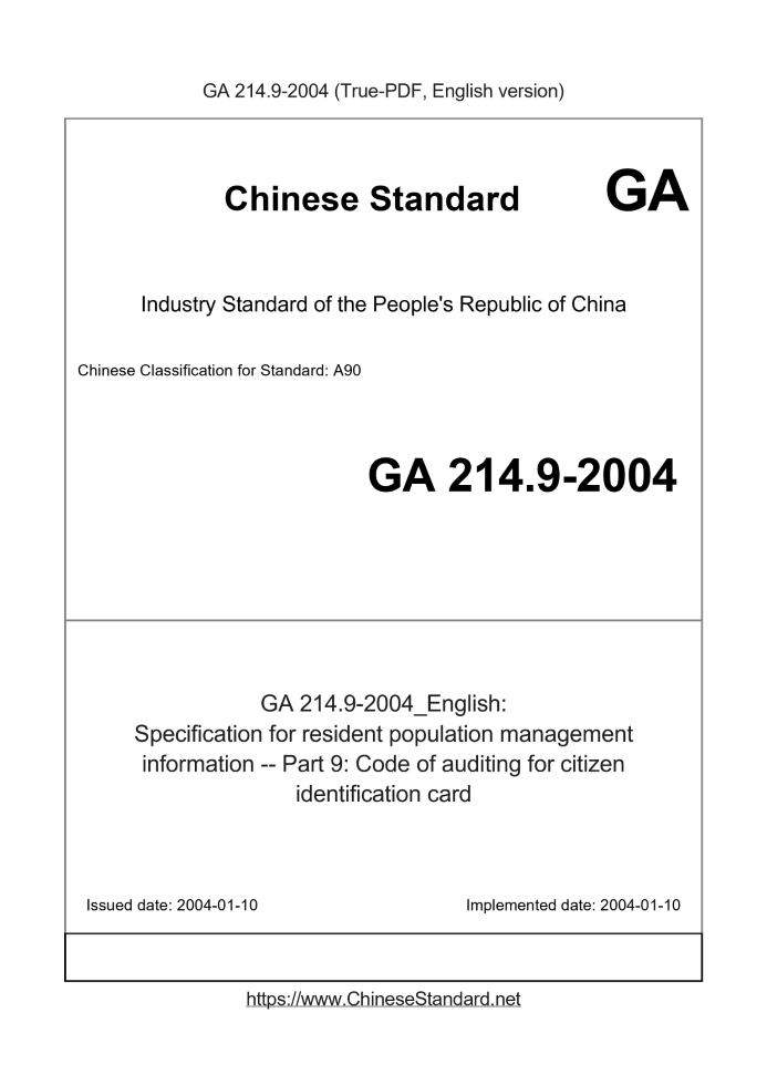 Delivery: <= 3 days. True-PDF full-copy in English will be manually translated and delivered via email. GA 214.9-2004: Specification for resident population management information -- Part 9: Code of auditing for citizen identification card Status: Obsolete