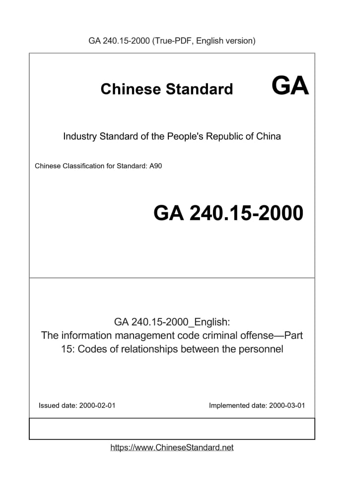 Delivery: <= 3 days. True-PDF full-copy in English will be manually translated and delivered via email. GA 240.15-2000: The information management code criminal offense—Part 15: Codes of relationships between the personnel Status: Obsolete