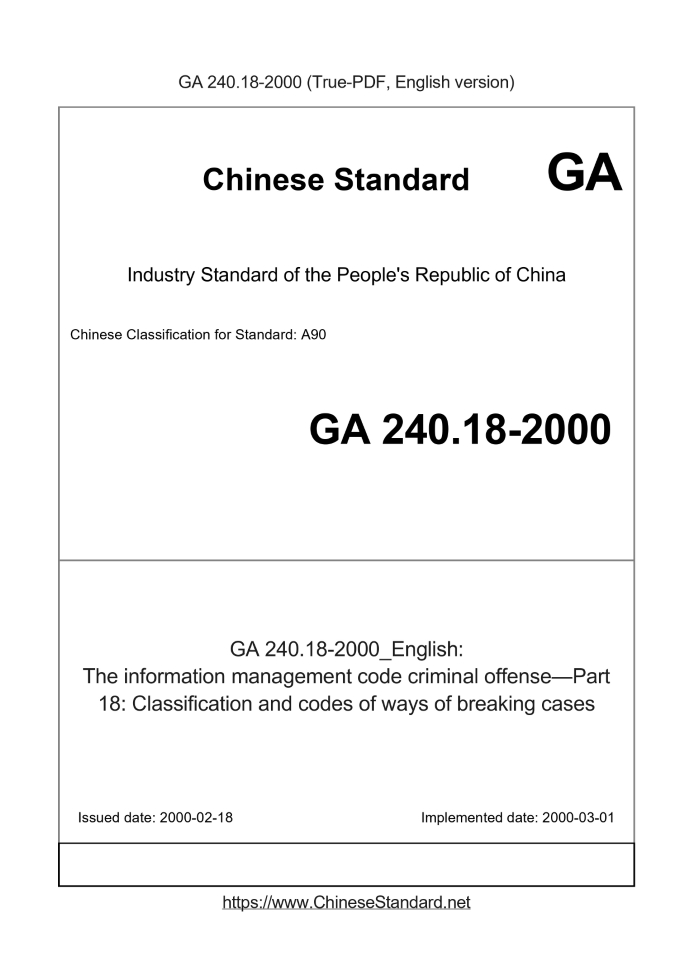 Delivery: <= 3 days. True-PDF full-copy in English will be manually translated and delivered via email. GA 240.18-2000: The information management code criminal offense—Part 18: Classification and codes of ways of breaking cases