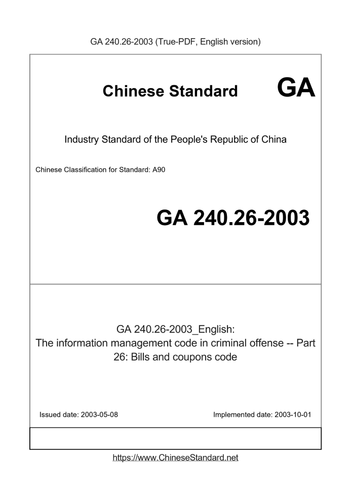 Delivery: <= 3 days. True-PDF full-copy in English will be manually translated and delivered via email. GA 240.26-2003: The information management code in criminal offense -- Part 26: Bills and coupons code