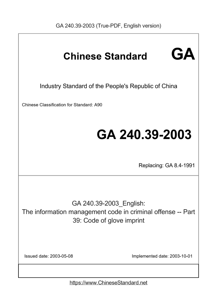Delivery: <= 3 days. True-PDF full-copy in English will be manually translated and delivered via email. GA 240.39-2003: The information management code in criminal offense -- Part 39: Code of glove imprint