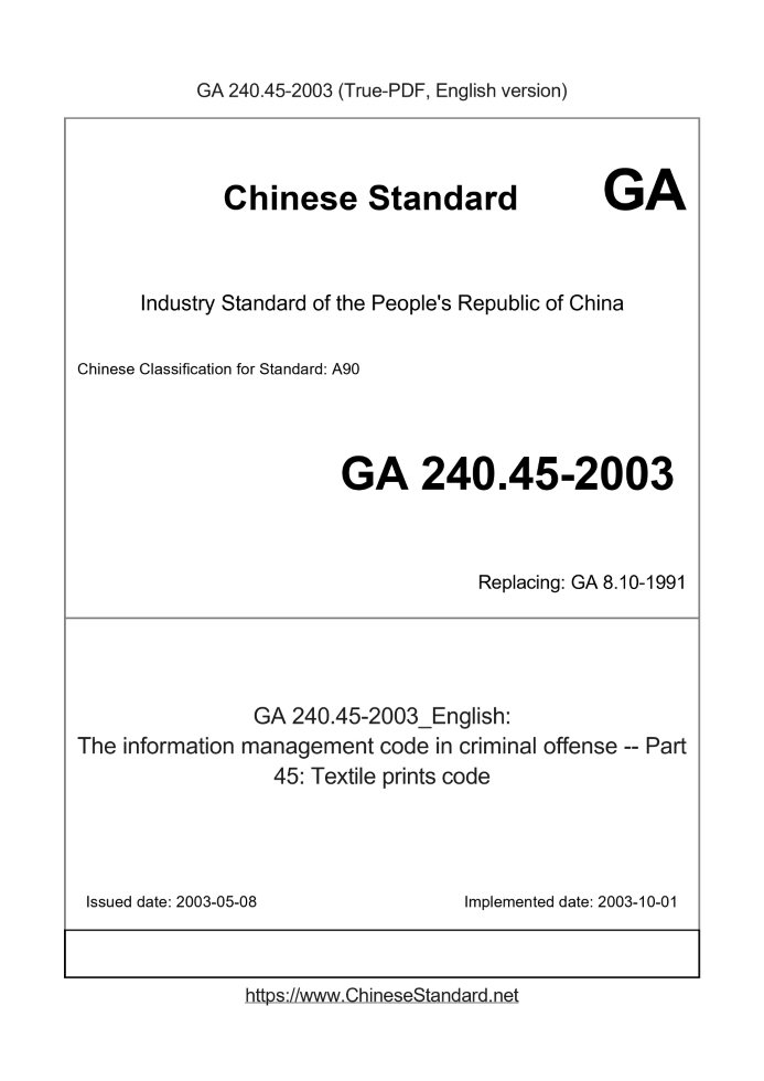 Delivery: <= 3 days. True-PDF full-copy in English will be manually translated and delivered via email. GA 240.45-2003: The information management code in criminal offense -- Part 45: Textile prints code