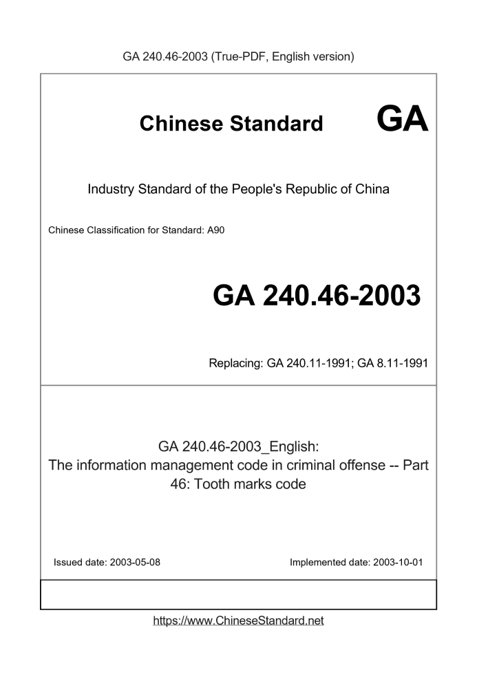 Delivery: <= 3 days. True-PDF full-copy in English will be manually translated and delivered via email. GA 240.46-2003: The information management code in criminal offense -- Part 46: Tooth marks code