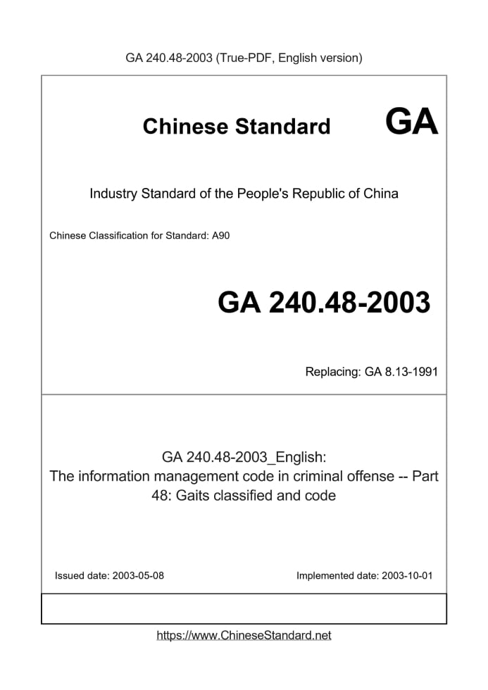 Delivery: <= 3 days. True-PDF full-copy in English will be manually translated and delivered via email. GA 240.48-2003: The information management code in criminal offense -- Part 48: Gaits classified and code