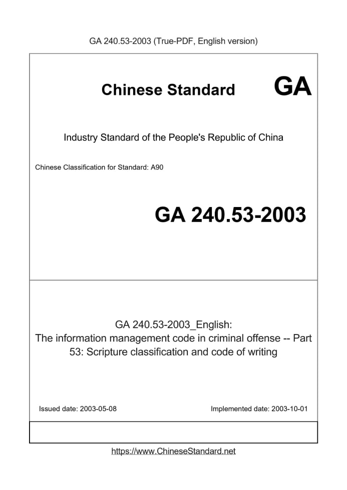 Delivery: <= 3 days. True-PDF full-copy in English will be manually translated and delivered via email. GA 240.53-2003: The information management code in criminal offense -- Part 53: Scripture classification and code of writing