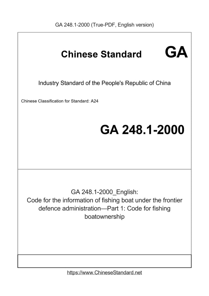 Delivery: <= 3 days. True-PDF full-copy in English will be manually translated and delivered via email. GA 248.1-2000: Code for the information of fishing boat under the frontier defence administration—Part 1: Code for fishing boatownership Status: Valid