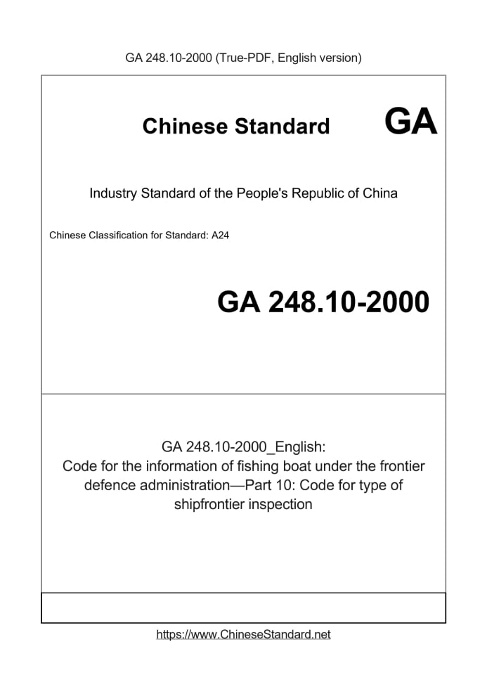 Delivery: <= 3 days. True-PDF full-copy in English will be manually translated and delivered via email. GA 248.10-2000: Code for the information of fishing boat under the frontier defence administration—Part 10: Code for type of shipfrontier inspection Status: Valid