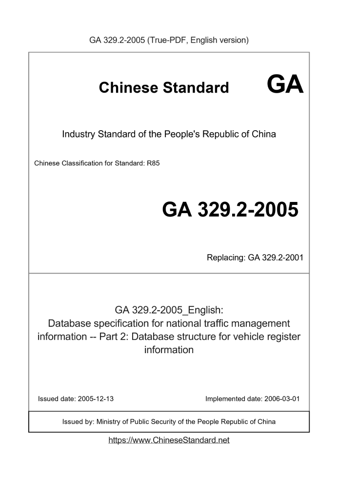 Delivery: <= 4 days. True-PDF full-copy in English will be manually translated and delivered via email. GA 329.2-2005: Database specification for national traffic management information -- Part 2: Database structure for vehicle register information GA 329.2: Historical versions