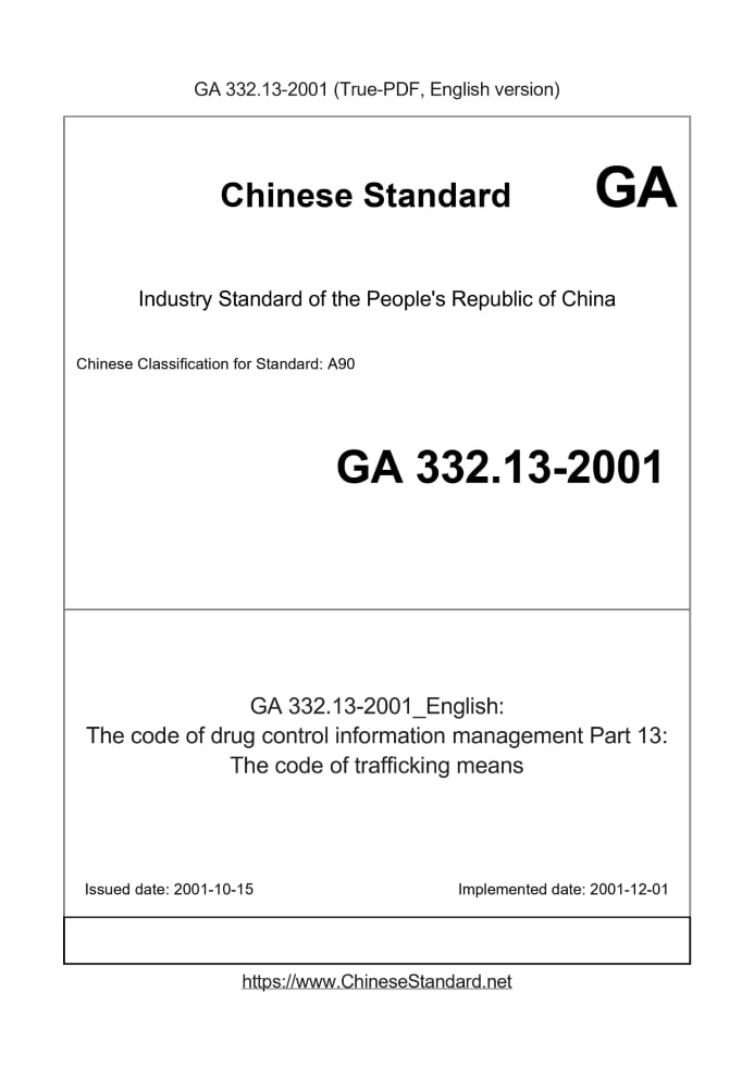 Delivery: <= 3 days. True-PDF full-copy in English will be manually translated and delivered via email. GA 332.13-2001: The code of drug control information management Part 13: The code of trafficking means