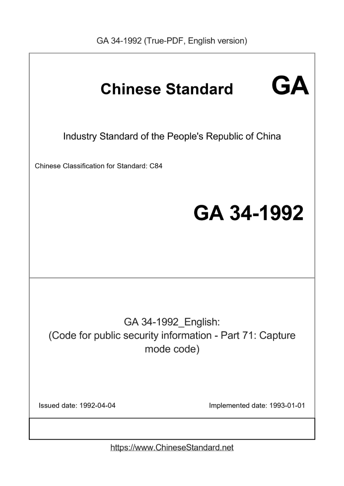 Delivery: <= 3 days. True-PDF full-copy in English will be manually translated and delivered via email. GA 34-1992: (Code for public security information - Part 71: Capture mode code) Status: Obsolete