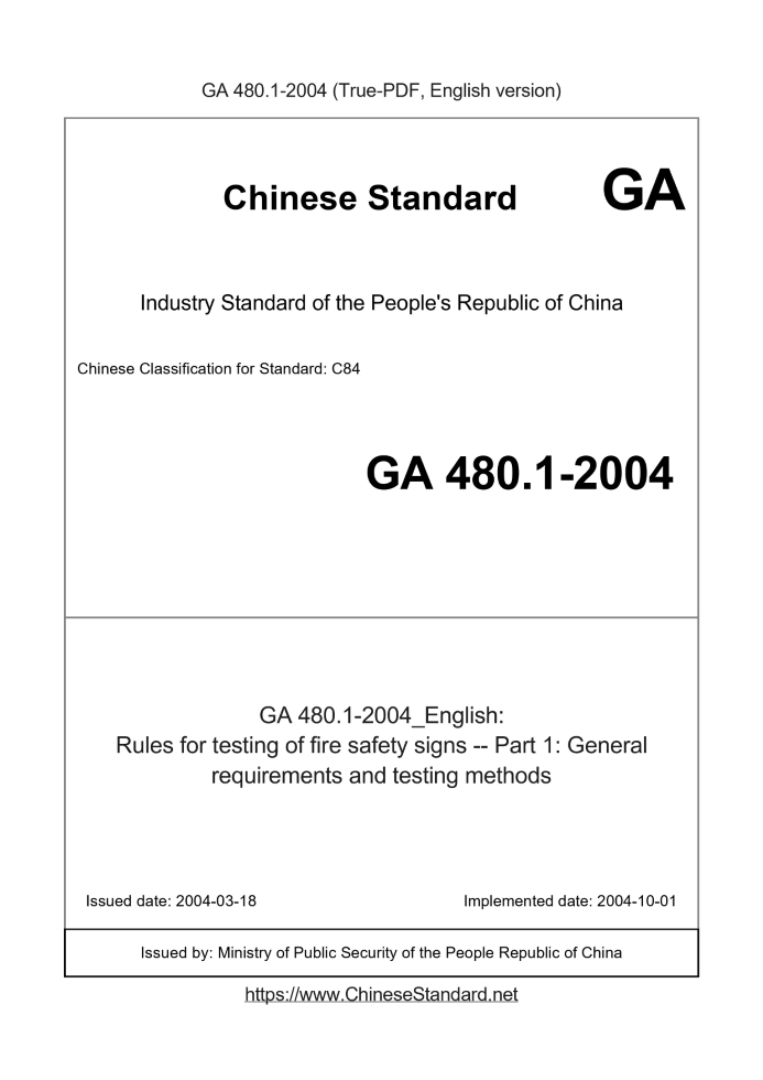 Basic dataStandard ID: GA 480.1-2004 (GA480.1-2004)Description (Translated English): Rules for testing of fire safety signs -- Part 1: General requirements and testing methods Sector / Industry: Public Security (Police) Industry Standard Classification of Chinese Standard: C84 Classification of International Standard: 13.220.01 Word Count Estimation: 11,125 Date of Issue: 2004-03-18 Date of Implementation: 2004-10-01 Quoted Standard: GB/T 1732; GB/T 1766-1995; GB/T 1771; GB/T 1865; GB/T 2406; GB/T 2828.1-2003; GB 2893; GB/T 8626; GB/T 9286; GB/T 10111; GB 13495-1992; GB/T 15239; GA 480.3-2004 Regulation (derived from): Industry Standard Record Announcement 2004 No. 5 (No. 53) Issuing agency(ies): Ministry of Public Security of the People Republic of China Summary: This standard specifies the general requirements for product classification, technical requirements, test methods, inspection rules, marking, packaging, transportation and storage of fire safety marking products. This standard applies to the fire safety information to the public expression of a variety of fire safety signs products. GA 480.1-2004: Rules for testing of fire safety signs -- Part 1: General requirements and testing methods---This is a DRAFT version for illustration, not a final translation. Full copy of true-PDF in English version (including equations, symbols, images, flow-chart, tables, and figures etc.) will be manually/carefully translated upon your order. Rules for testing of fire safety signs -- Part 1. General requirements and testing methods ICS 13.220.01 C84 People's Republic of China Public Safety Industry Standard General technical conditions for fire safety signs Part 1. General requirements and test methods Released on.2004-03-18 Implementation of.2004-10-01 Ministry of Public Security ForewordChapters 4, 5, 7, and 8 of this part of GA 480 are mandatory, and the rest are recommended. GA 480 "General Technical Conditions for Fire Safety Signs" is GB 13495 "Fire Safety Sign" and GB 15630 "Fire Safety Signs" The supporting standards of the requirements, the corresponding technical requirements and test methods for fire safety sign products, as a production and market Technical regulations for management. According to the current common types of fire safety sign products, the GA 480 is divided into the following separate parts. --- Part 1. General requirements and test methods; --- Part 2. Conventional fire safety signs; --- Part 3. Light-storing fire safety signs; --- Part 4. Retroreflective fire safety signs; ---Part 5. Fluorescent fire safety signs; ---Part 6. Enamel fire safety signs; --- Part 7. Internal lighting fire safety signs; In the process of approving the GA 480, due to the "Internal Illuminated Fire Safety Sign" originally intended to be approved as Part 5 Some of the contents of GB 17945-2000 "Fire Emergency Lights" need to be coordinated. In order to speed up the release of GA 480, we will suspend the Part of the approval work, after the relevant standards are coordinated, the remaining work is completed. In order to facilitate the use of the standard, it will be originally intended as part 6 And the "Fluorescent Fire Safety Sign" and "Enamel Fire Safety Sign" approved in Part 7 were submitted for approval as Part 5 and Part 6, pending The illuminating fire safety sign was re-approved as part 7 after completion of coordination. The contents of each part of the GA 480 are divided by the color material characteristics of the logo. In the actual production process, due to the difference in substrate and color material, It can produce logo products with two or more characteristics. In the process of using GA 480, all parties concerned should The applicability of the article is explored. This part is the first part of the GA 480. It is aimed at the various types of fire safety sign products commonly available on the market in terms of geometric size, color, General requirements and test methods for brightness factor, adhesion of color materials, weather resistance, corrosion resistance, water resistance, impact resistance and flammability Law and so on. This part is proposed by the first sub-technical committee of the National Fire Protection Standardization Technical Committee. This part is under the jurisdiction of the first sub-technical committee of the National Fire Protection Standardization Technical Committee. This part was drafted by the Tianjin Fire Science Research Institute of the Ministry of Public Security. The main drafters of this section. Yao Songjing, Liu Yukai, Han Zhanxian, Chi Lifa, Liu Lianxi. General technical conditions for fire safety signs Part 1. General requirements and test methods1 ScopeThis part of GA 480 is a product classification, technical requirements, test methods, inspection rules, signs, packaging, and transportation of fire safety sign products. General requirements for transmission and storage. This section applies to various fire safety sign products that express fire safety information to the public.2 Normative referencesThe terms in the following documents become the terms of this section by reference to this part of GA 480. For dated references, All subsequent amendments (not including errata content) or revisions do not apply to this section, however, an agreement is encouraged under this section. The parties are studying whether the latest version of these documents can be used. For undated references, the latest edition applies to this section. GB/T 1732 paint film impact resistance test method GB/T 1766-1995 Rating method for aging of paints and varnishes [neq ISO 4628. 1980 (all parts)] GB/T 1771 Determination of neutral salt spray resistance of paints and varnishes (GB/T 1771-1991, eqv ISO 7253.1984) GB/T 1865 Paint and varnish artificial weathering and artificial radiation exposure (filtered xenon arc radiation) (GB/T 1865-1997, Eqv ISO 11341.1994) GB/T 2406 Test method for burning properties of plastics - Oxygen index method (GB/T 2406-1993, 