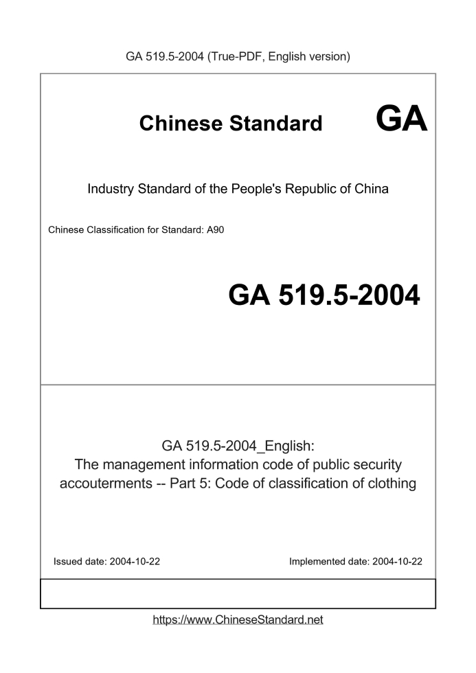 Delivery: <= 3 days. True-PDF full-copy in English will be manually translated and delivered via email. GA 519.5-2004: The management information code of public security accouterments -- Part 5: Code of classification of clothing