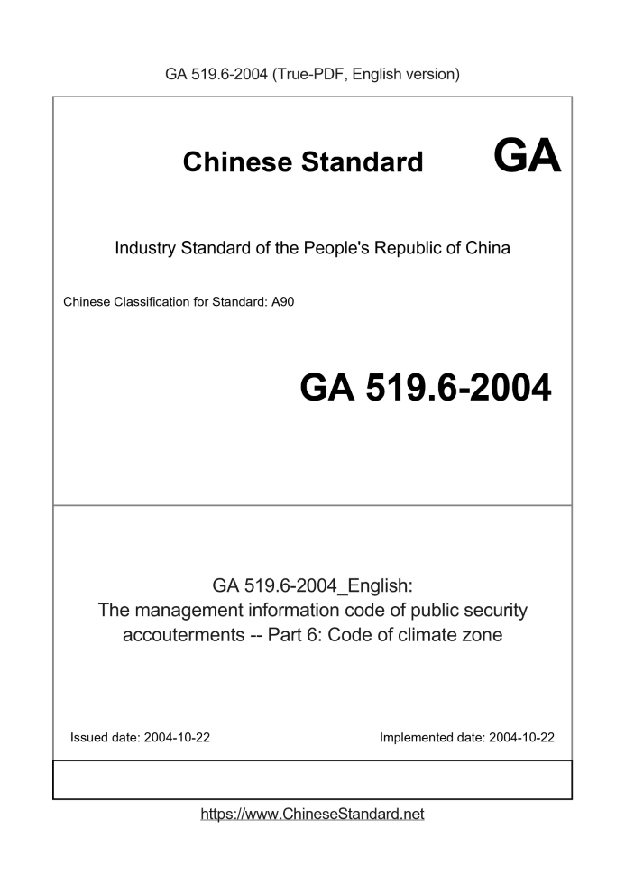 Delivery: <= 3 days. True-PDF full-copy in English will be manually translated and delivered via email. GA 519.6-2004: The management information code of public security accouterments -- Part 6: Code of climate zone