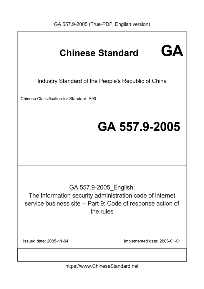 Delivery: <= 3 days. True-PDF full-copy in English will be manually translated and delivered via email. GA 557.9-2005: The information security administration code of internet service business site -- Part 9: Code of response action of the rules