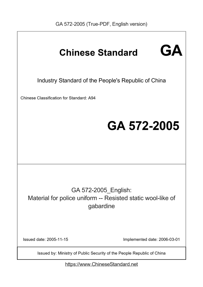 Delivery: <= 3 days. True-PDF full-copy in English will be manually translated and delivered via email. GA 572-2005: Material for police uniform -- Resisted static wool-like of gabardine