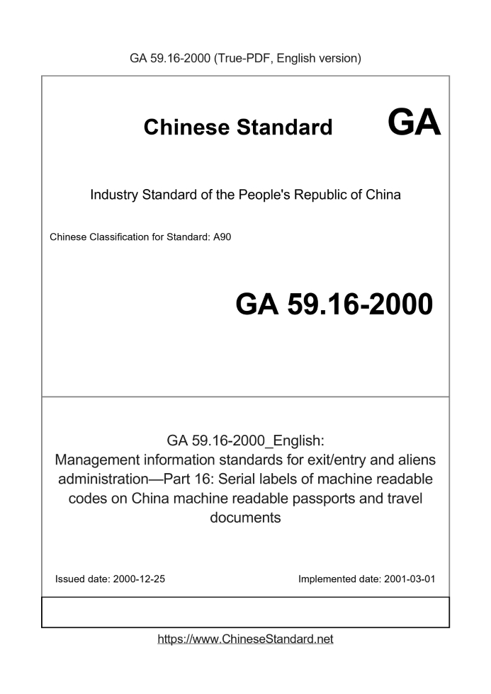 Delivery: <= 3 days. True-PDF full-copy in English will be manually translated and delivered via email. GA 59.16-2000: Management information standards for exit/entry and aliens administration—Part 16: Serial labels of machine readable codes on China machine readable passports and travel documents Status: Obsolete