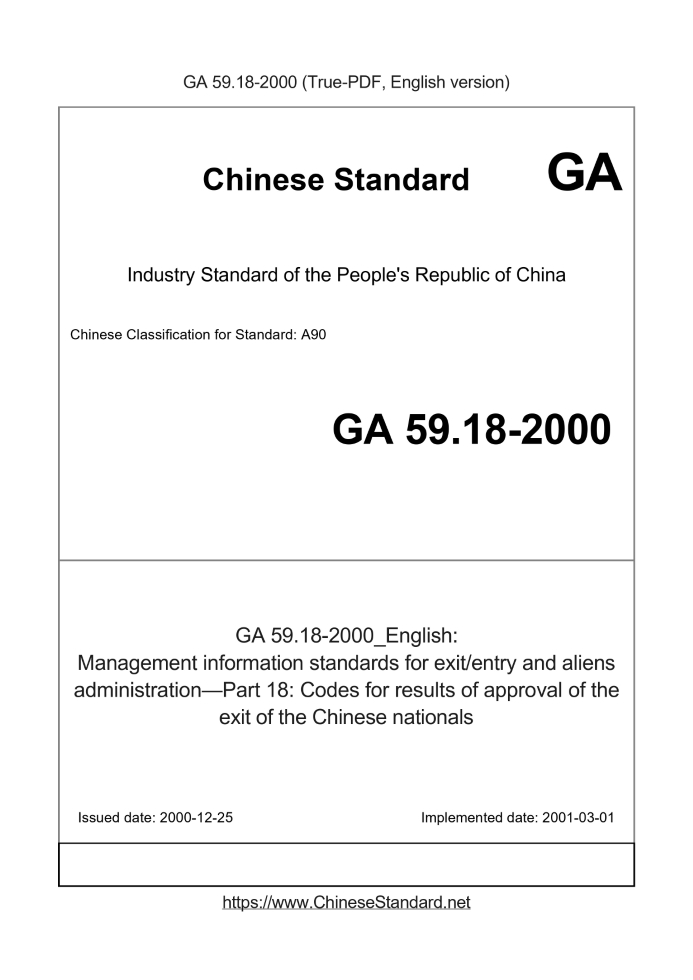Delivery: <= 3 days. True-PDF full-copy in English will be manually translated and delivered via email. GA 59.18-2000: Management information standards for exit/entry and aliens administration—Part 18: Codes for results of approval of the exit of the Chinese nationals Status: Obsolete