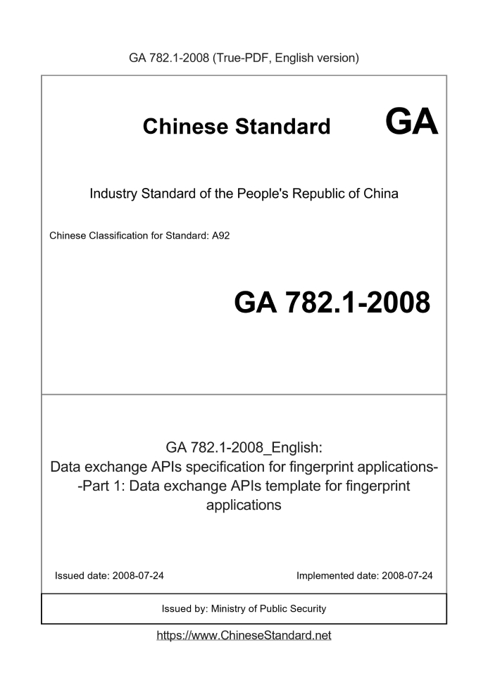 Basic dataStandard ID: GA 782.1-2008 (GA782.1-2008)Description (Translated English): Data exchange APIs specification for fingerprint applications--Part 1: Data exchange APIs template for fingerprint applications Sector / Industry: Public Security (Police) Industry Standard Classification of Chinese Standard: A92 Classification of International Standard: 13.310 Word Count Estimation: 4,490 Date of Issue: 2008-07-24 Date of Implementation: 2008-07-24 Quoted Standard: GA 773-2008 Issuing agency(ies): Ministry of Public Security Summary: This standard specifies the fingerprint information application exchange interface model. This standard is applicable to the data exchange between National Fingerprint Management Information System and Fingerprint Automatic Identification System. GA 782.1-2008: Data exchange APIs specification for fingerprint applications--Part 1: Data exchange APIs template for fingerprint applications---This is a DRAFT version for illustration, not a final translation. Full copy of true-PDF in English version (including equations, symbols, images, flow-chart, tables, and figures etc.) will be manually/carefully translated upon your order. Data exchange APIs specification for fingerprint applications - Part 1. Data exchange APIs template for fingerprint applications ICS 13.310 A92 People's Republic of China Public Security Industry Standards Application Interface Specification fingerprint information exchange Part 1. Application of fingerprint information exchange interface model Posted 2008-07-24 2008-07-24 implementation People's Republic of China Ministry of Public Security ForewordAll technical content in this section is mandatory. GA 782 "fingerprint information exchange application interface specification" is divided into three parts. --- Part 1. Application of fingerprint information exchange interface model; --- Part 2. Status fingerprint information exchange interface; --- Part 3. fingerprint data exchange interface. This is Part 1 GA 782 is. This part is proposed by the Ministry of Public Security Criminal Investigation Bureau. The criminal section of the National Criminal Information Technology Standardization Technical Committee Technical Committee (SAC/TC179/SC2) centralized. This section drafted by. Ministry of Public Security Criminal Investigation Bureau, Jiangsu Provincial Public Security Criminal Investigation Bureau, Ministry of Public Security Evidence Identification Center, Aerospace Science and Industry collection Group II Hospital 2 seven, Beijing PKU Fingerprint Technology Co., Ltd., Beijing Orient Golden Finger Technology Co., Ltd., Beijing Hisign tech CO., LTD. The main drafters of this section. Wangying Wei, Zhou Xinmin, Zhangguo Chen, Xie Xiaodan, Wang Gang, Xu Chunguang, Zhu Guoping. Ministry of Public Security Criminal Investigation Bureau commissioned this section shall be interpreted. Application Interface Specification fingerprint information exchange Part 1. Application of fingerprint information exchange interface model1 ScopeGA 782 this section provides for the exchange of fingerprint information application interface model. This section applies to data exchange between national investigation fingerprint Management Information System and Automatic Fingerprint Identification System.2 Normative referencesThe following documents contain provisions which, through reference in this Part of GA 782 constitute provisions of this section. For dated references, All subsequent amendments (not including errata content) or revisions do not apply to this section, however, encourage the agreement on this section Whether the parties can study the latest versions of these documents. For undated reference documents, the latest versions apply to this section. GA 773-2008 AFIS term3 Terms and DefinitionsGA 773-2008 terms and definitions apply to this section established.4 Interface ModelInterface with the application, the relationship between AFIS (or other fingerprint system) shown in Figure 1. Represents the contents of the black box This interface.1 fingerprint information exchange interface application model diagram5 JA Vp A call exampleorg. apache. axis. client. Cal _cal = createCal (); _cal. setOperation (_operations [0]); _cal. setUseSOAPAction (true); _cal. setSOAPActionURI ( ""); _cal. setSOAPVersion (org.apache.axis.soap.SOAPConstants.SOAP11_CONSTANTS); _cal. setOperationName (newjavax.xml.namespace.QName ( "http.//service.shel.casic.com", "GetDataInfo")); setRequestHeaders (_cal); setAttachments (_cal); try { java. lang. Object_resp = _cal. invoke (newjava.lang.Object [] {userid, pwd, No, Type}); ......Tips & Frequently Asked Questions:Question 1: How long will the true-PDF of GA 782.1-2008_English be delivered?Answer: Upon your order, we will start to translate GA 782.1-2008_English as soon as possible, and keep you informed of the progress. The lead time is typically in 9 seconds (download/delivered in 9 seconds). The lengthier the document the longer the lead time.Question 2: Can I share the purchased PDF of GA 782.1-2008_English with my colleagues?Answer: Yes. The purchased PDF of GA 782.1-2008_English will be deemed to be sold to your employer/organization who actually pays for it, including your colleagues and your employer's intranet.Question 3: Does the price include tax/VAT?Answer: Yes. Our tax invoice, downloaded/delivered in 9 seconds, includes all tax/VAT and complies with 100+ countries' tax regulations (tax exempted in 100+ countries) -- See Avoidance of Double Taxation Agreements (DTAs): List of DTAs signed between Singapore and 100+ countriesQuestion 4: Do you accept my currency other than USD?Answer: Yes. If you need your currency to be printed on the invoice, please write an email to Sales@ChineseStandard.net. In 2 working-hours, we will create a special link for you to pay in any currencies. Otherwise, follow the normal steps: Add to Cart -- Checkout -- Select your currency to pay. |