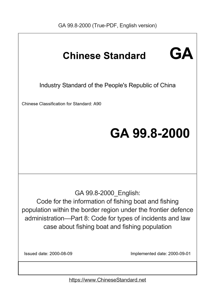 Delivery: <= 3 days. True-PDF full-copy in English will be manually translated and delivered via email. GA 99.8-2000: Code for the information of fishing boat and fishing population within the border region under the frontier defence administration—Part 8: Code for types of incidents and law case about fishing boat and fishing population